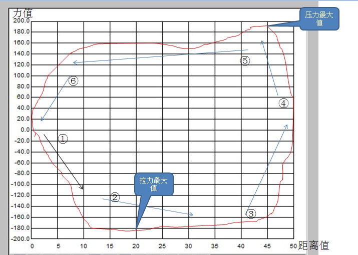 曲線要求是這樣的,主要測量50mm距離值內減震器的拉壓力值的變化,減震器從距離0mm開始先拉出來,力值曲線開始從0向下畫,當拉到50mm時,停止拉,開始壓回去,距離開始從50mm減小,直至壓到0mm,力值為0。