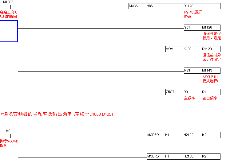 這個通訊程式寫完了,還要設(shè)置變頻器才行的。如通訊格式 站號 控制指令來源,等等。。。。。。
