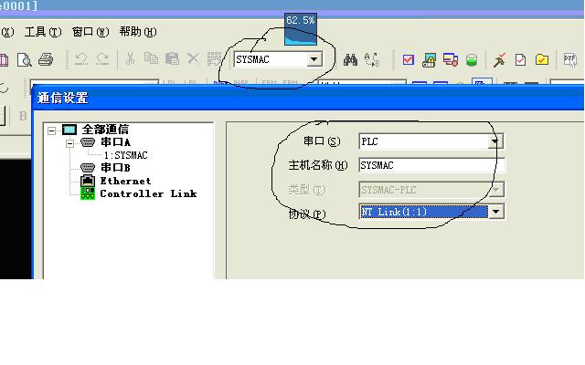 3:界面軟件設(shè)置主機(jī)為SYSMAC,選串口A,串口為PLC,主機(jī)名稱為SYSMAC,協(xié)議NT LINK (1:1)
