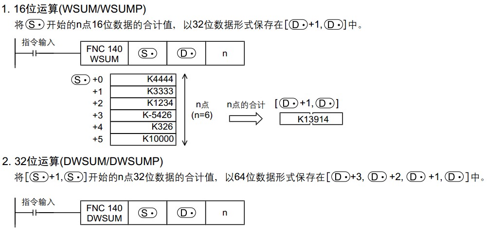 WSUM   D200  D310   K101      計算后的結果以32位數據形式保存在D310(低位)、D311(高位)