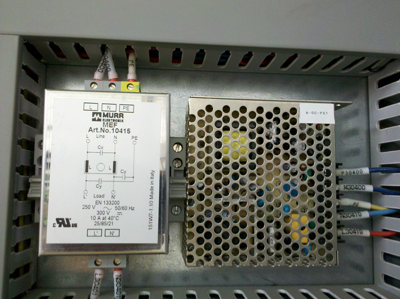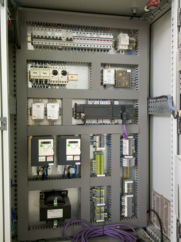 柜子挺好看的呀,就是不知道你下面那個像變壓器的是干什么的,要用這么大的變壓器,還是電抗器?變頻器上面那兩小的看不清楚,難道也是開關電源?不是吧。三進三出,難道是保護變頻的?