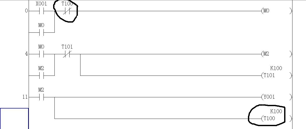 如圖中所示,梯形圖是順序執行的,在程序第0行中,有個時間繼電器常閉觸點T100,但給T100的時間賦值是在第11行,所以程序執行到第0行的T100時間繼電器常閉觸點后,是否開始計時?延時10秒后T100常閉觸點斷開?還是?第0行的T100常閉觸點會一直閉合,直到遇到給T100賦值的語句?實在是困惑,求解,萬分感謝!!!