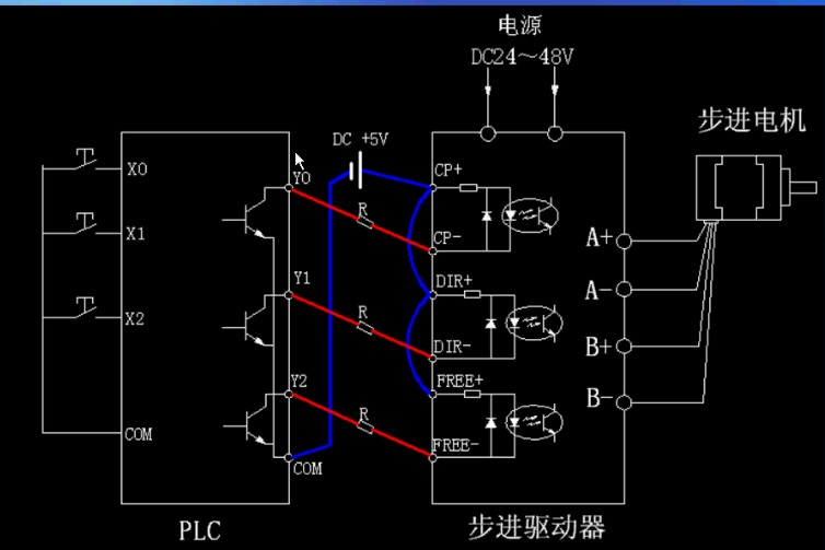 步進電機驅(qū)動器控制部分是無源驅(qū)動,因此要引入驅(qū)動電源,通過PLC的輸出來控制脈沖數(shù)量、脈沖方向、脫機信號