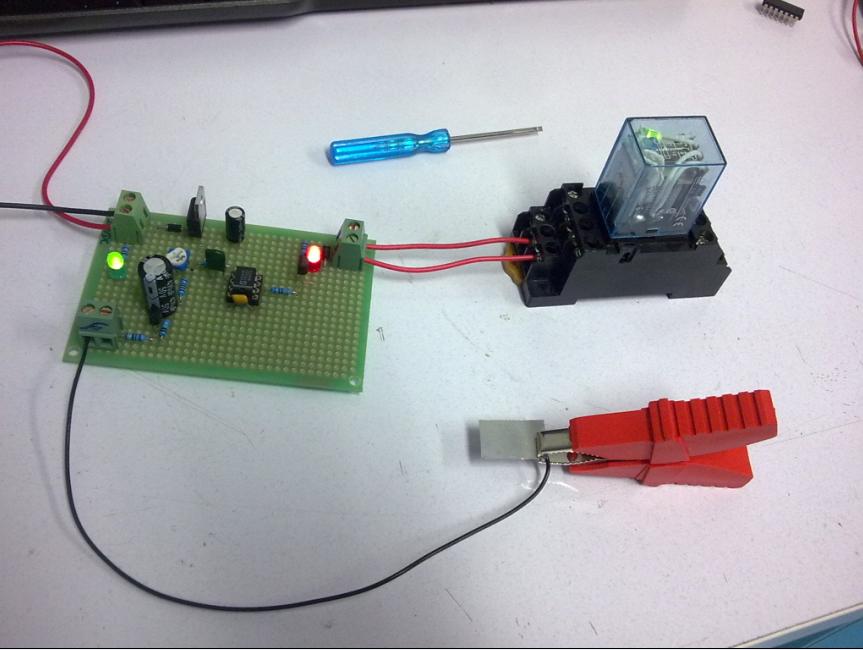 用555定時器作觸摸開關時,即使人不和大地接觸和人不直接接觸圖中三極管Q1的基極,而是人站在一個木板上,手拿著一把螺絲刀的絕緣柄,用螺絲刀的金屬頭去觸碰圖中的金屬片,電路也可以被觸發。