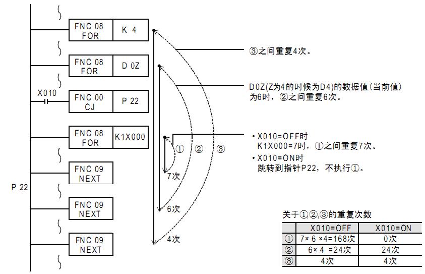 在子程序中也可以再次調(diào)用其他子程序,這種指令用法也叫做嵌套,子程序內(nèi)的CALL指令最多允許4層嵌套。