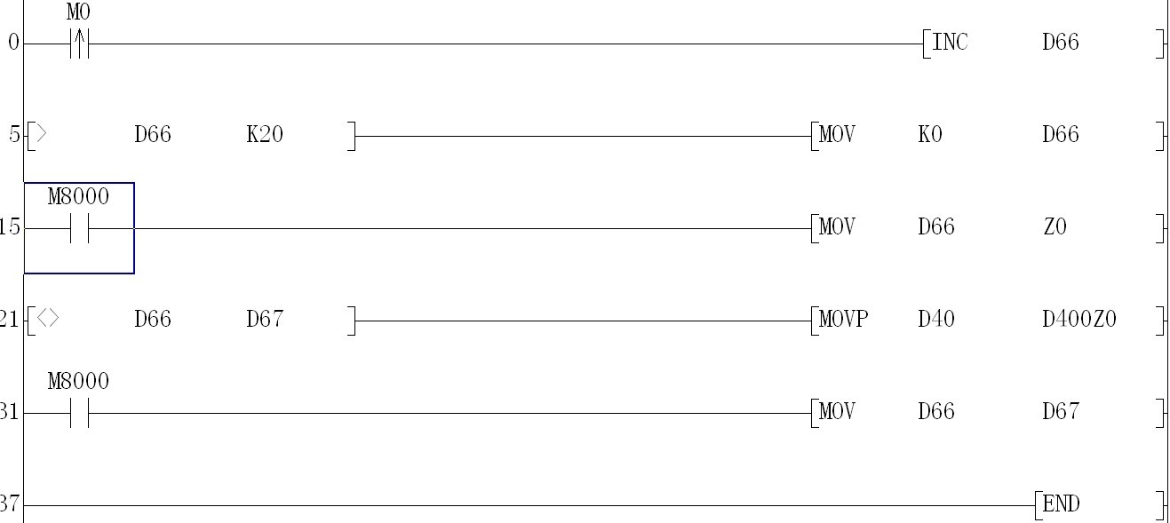 已知數(shù)據(jù)寄存器d66中的數(shù)據(jù)從1遞增到20,d40中的值隨時間變化,現(xiàn)在我想把d66從0變到1的瞬間把D40的值賦給D400,從1到2的瞬間把D40的值賦給D401,以此類推,直到D66值變?yōu)?0,開始下一循環(huán)。我目前的單段寫法如附件圖中所示,從節(jié)省掃描周期的角度,哪位有更簡潔的做法?我目前的做法,要寫20段,每段占14步