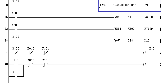 請看看這段程序什么意思PLC是FX3U的,這個$MOV "2A6N001K1L06" D90里面的2A6N001K1L06這些是什么意思?