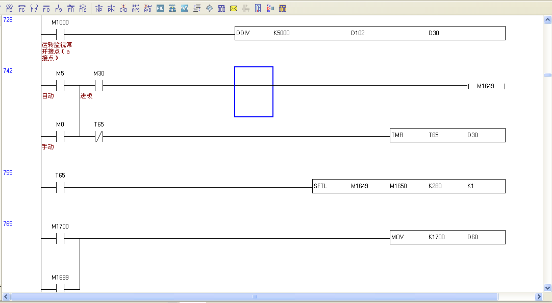 如圖,一個移位程序;從M1649開始,中間段固定位置開啟電磁閥。。D102:輸送變頻器頻率
