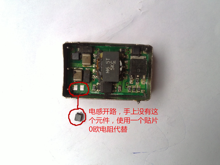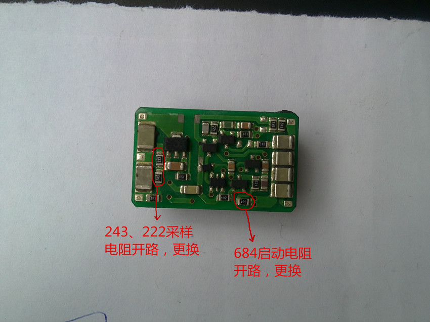 這個模塊要外置DC24V供電(三菱、歐姆龍PLC模擬量輸出模塊,電壓型輸出的都要外置供電),DC24V經(jīng)過DC/DC轉(zhuǎn)換后,輸出+15V、-15V,測量以上 2組電壓都沒有輸出,再測量2組電壓的正向電阻1.5K以上正常,排除是負載影響燒壞電源,拆下開關(guān)電源模塊,型號是MT5-2415W,因為這個模塊不容易購買,故只好拆開維修,內(nèi)部使用軟硅膠密封,先清除硅膠,接著檢查電路,發(fā)現(xiàn)-15V輸出的濾波電感開路,因為手上沒有這個電感,使用0歐電阻代替,再認真檢查,發(fā)現(xiàn)損壞3個貼片電阻,分別是:采樣電阻2個(243、222)、啟動電阻1個(684),更換以上4個元件,通電,開關(guān)電源輸出+15V、-15V電壓,正常,使用軟密封膠密封后,將開關(guān)電源模塊焊回電路板,通電,測量模塊輸出電壓正常,故障排除。