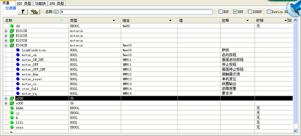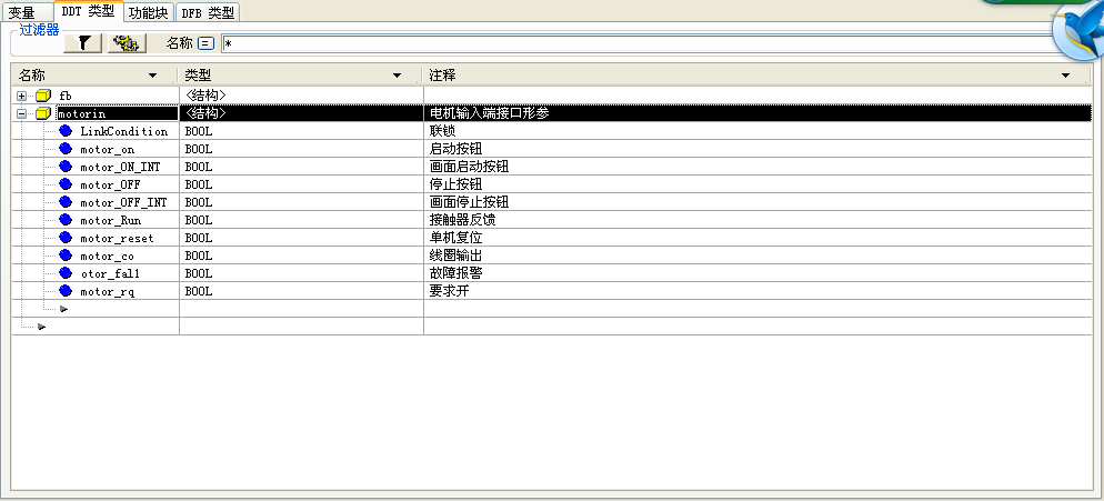 大家好,現(xiàn)在有兩個問題請教大家。 1、我在數(shù)據(jù)編輯器建了一個DDT結構類型,完了我在變量里建立了一個變量,類型取的是剛建立的結構類型,我想問的是,在我建立的結構變量之后我給的是一個%mw的地址,給%M地址顯示錯誤。我給了%mw地址之后自動分配了地址,地址中怎么有兩個相同的地址,那我上位機上如何讀取地址??? 難道結構變量不能這么用了,還要分開來一個一個建立變量嗎?第一次用,謝謝各位!下面有圖。 2.我在導出的功能塊DFB中建立一段電機程序,中間有幾個變量是外部公用的點,(比如說統(tǒng)一復位按鈕、公共的聯(lián)鎖點、都是數(shù)字量輸入點)西門子都可以隨便寫,但是這里不能在 DFB 中使用直接地址,我要怎么辦呢?只能在建立一些輸入點,完了沒有電機在填一下相同的地址了??謝謝各位了…… |
