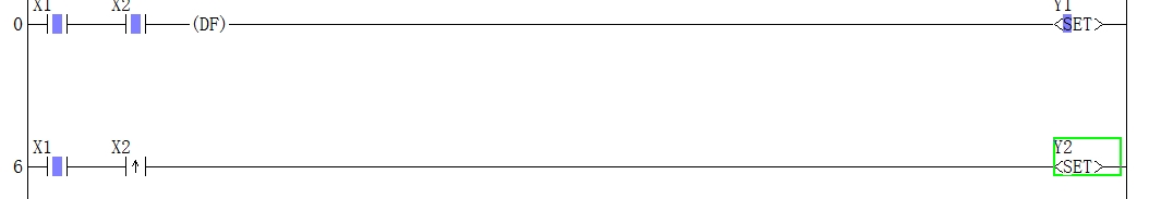 第二行,因X1先動作(已接通),X2動作時,對X2取上升沿,此時整個通路接通一個周期,所以Y2置位