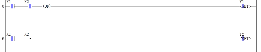 DF指令是對其前面所有的邏輯接通后做上升沿微分,也就是說,DF指令前的接點全部接通后接通一個周期,而 ↑ 只對使用此符號的單個接點取微分