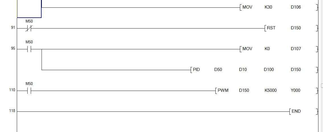 PID D50 D10 D100 D150 -----D50我設定的是500(也就是50攝氏度),D10是加熱測得的溫度,D100-1000,D101-K1,D102-K50,D103-K150,D104-K10,D105-K0,D106-K0,我在實際調試監控的過程中,D10為490的時候,D150的值還是32767,直到D10的值大于D50的時候才慢慢降下來,這樣的話實際溫度已經超過設定值,不知是我哪里參數設錯了還是怎么的,應該D10的值接近D50的時候,D150的值也相應的變小才對呢,請知情的大師們給個意見,我用的溫控模塊式FX2N-4AD-TC
