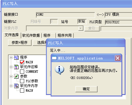 日前得一三菱FX2-80MR plc,因為不能解除程序密碼,拔掉電池放了幾天,后裝回電池開機,PROG.E指示燈閃爍,寫入程序提示“起始范圍設置錯誤”。