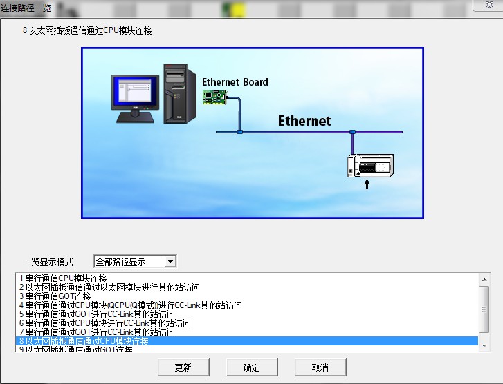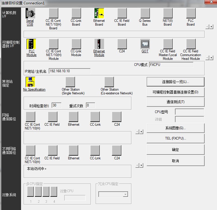 在連接目標中 :計算機側選擇以太網板卡、可編程控制器側 (PLC Module中)選擇以態網端口直接連接就行。