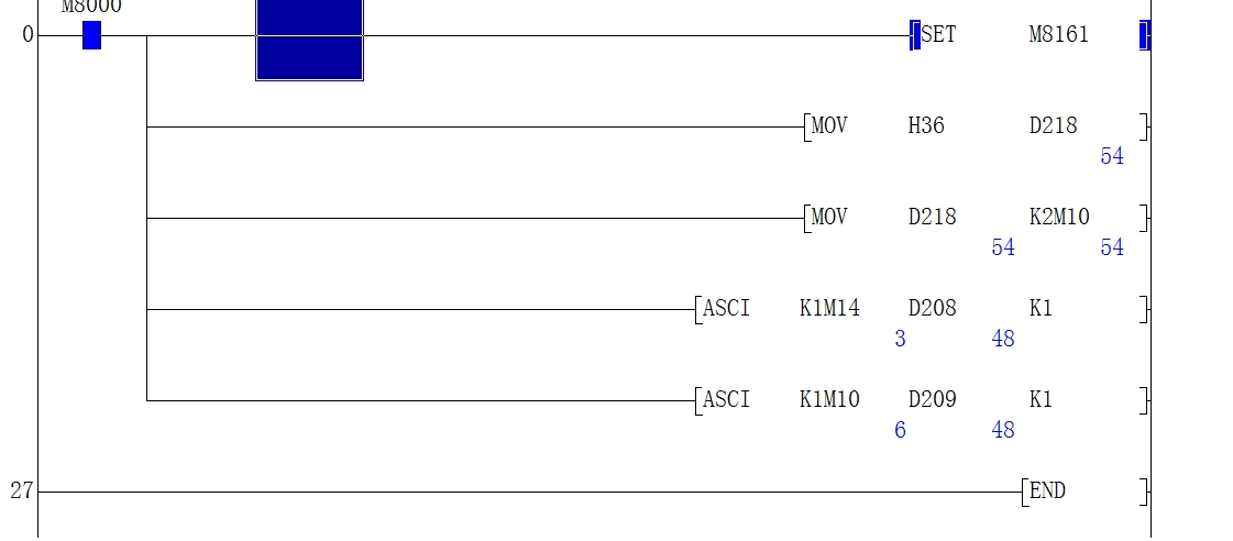我這幾天在學習plc與變頻器通訊的問題,這其中就遇到了一個這樣的問題如果輸入mov h36 d218  mov d218 k2m10    asci k1m14 d208 k1      asci k1m10 d209 k1 怎么到最后轉換出的d208和d209都是0,按理說轉換為asci碼d208應該是h33,d209應該是h36啊,這個時候我不用k2m10這個位式元件,直接用asci h36 d208 k1就能得到相應asci碼所對應的10進制,我很迷惑,就高手賜教啊。