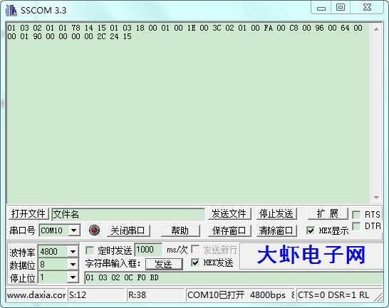 主機再接著發送數據數據:01 03 02 0C F0 BD