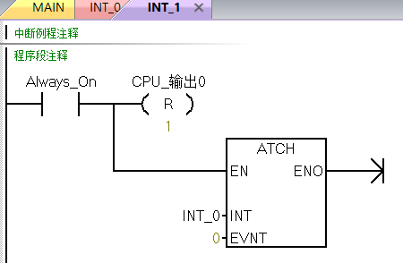 在主程序中開啟中斷,當I0.0的上升沿信號到來時進入INT0中斷程序,置位Q0.0。