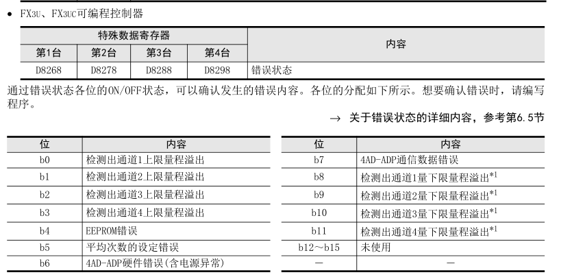 最近看前人寫的三菱PLC FX3U模擬量采集模塊寫的程序RST D8268.6,我查編程手冊只看到特殊數據寄存器D8268的介紹,沒找到D8268的定義。請問有誰有關于寄存器每一位的具體定義嗎?還望分享一下,萬分感謝。