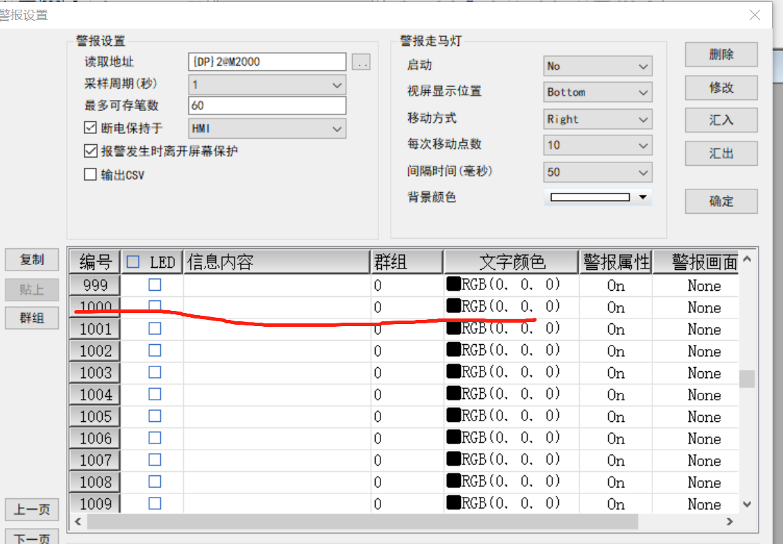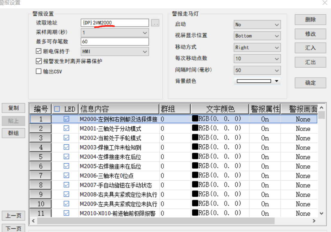 ![]() 我在報(bào)警設(shè)置里設(shè)M2000開始的做為報(bào)警,從M2000到M2058為止有組態(tài)報(bào)警信息,M2058之后沒有組態(tài)報(bào)警信息,并且M3000以后的寄存器程序里有另用。現(xiàn)在發(fā)現(xiàn)M3000為1時(shí)報(bào)警畫面里也會(huì)出現(xiàn)報(bào)警信息,只不過信息內(nèi)容為空白,這是怎么回事?看了一下報(bào)警設(shè)置,最大編號(hào)是到2048條,難道我從M2000開始,到M4047程序里都不能另外再用嗎。 |