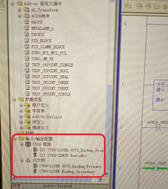 有一套AB的compactlogix的L33ER系統,冗余的CPU是通過1769-SDN的DeviceNet模塊下掛兩個從站的I/O模塊的,如圖2,但是在使用RSLogix5000系統上傳程序時,發現程序文件的硬件結構中沒有這些DeviceNet模塊的信息,如圖1紅圈處,是軟件安裝中缺少什么組件嗎,導致這些DeviceNet的設備上傳不上來,請AB的高手說說,要怎么才能將其上傳,謝謝!~