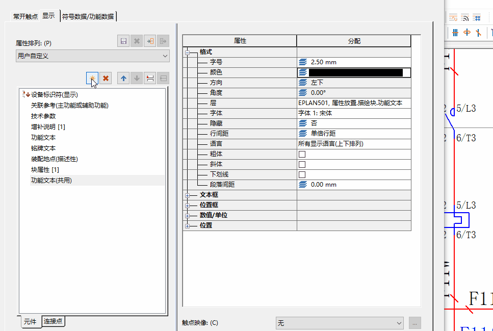 首先線圈部分的功能文本寫好,然后到觸點部分右鍵屬性》》切換到顯示》》點擊新建》》功能》類別》功能文本(共用)