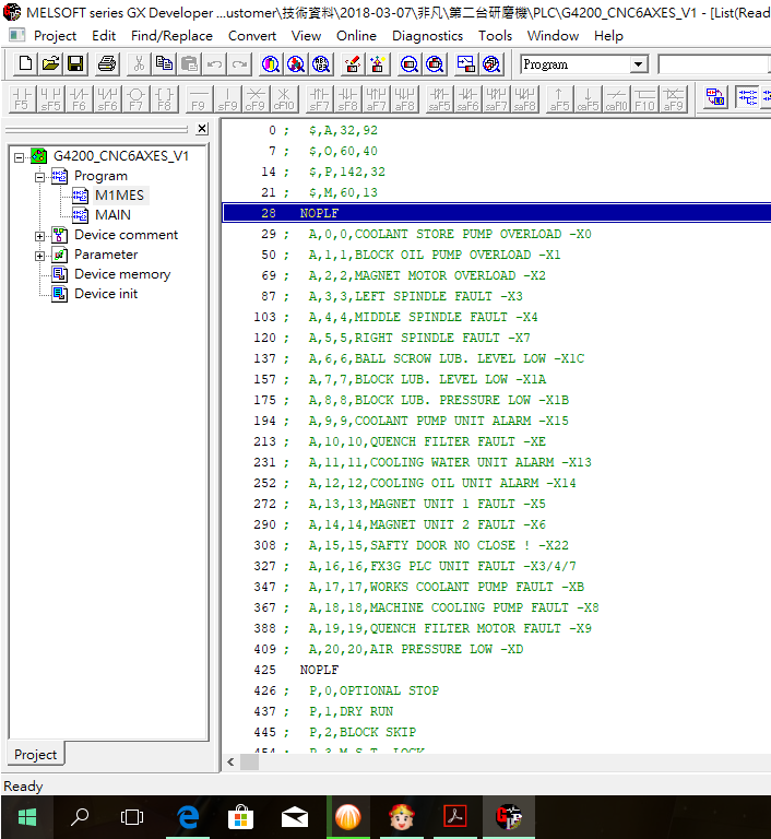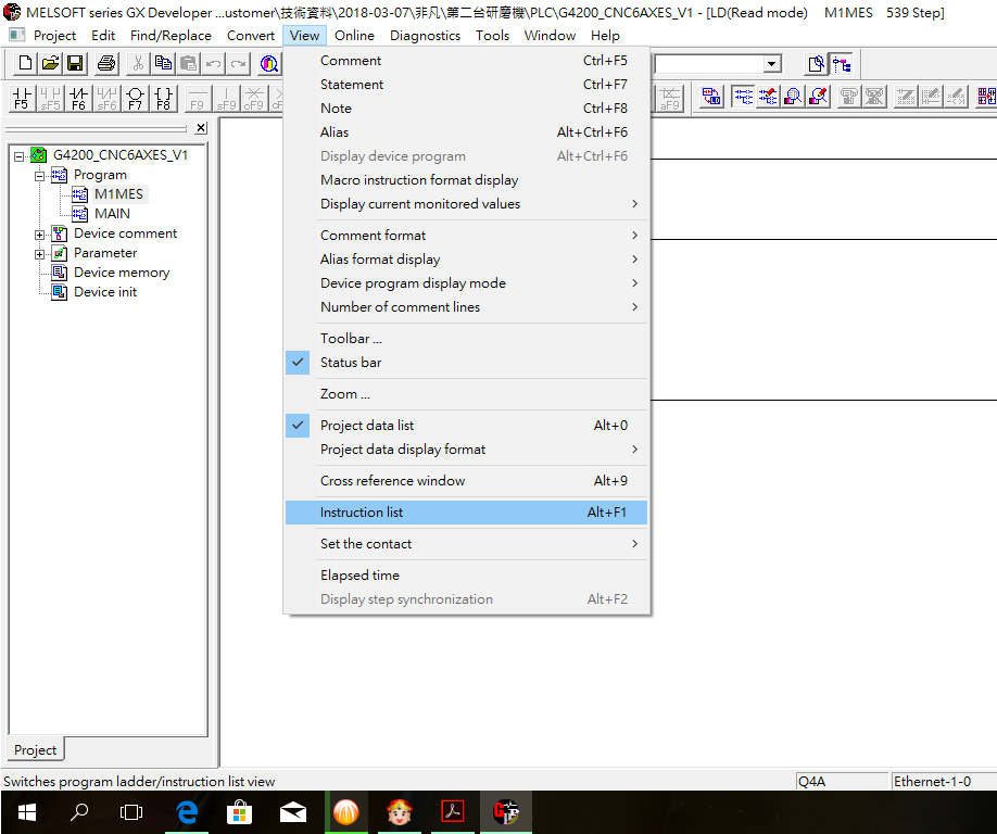 引用引用第2樓kenneth于2018-07-19 13:40發(fā)表的 :Dear langui,抱歉, 我的開發(fā)系統(tǒng)是英文, 但你慢慢研究應(yīng)該會知道如何設(shè)定.你看圖左邊有M1MES的檔案, 先將它點(diǎn)選出來, 然後在Menu 的View選項(xiàng)內(nèi)要勾選Instruction List, 之後再去撰寫你的Alarm Message.