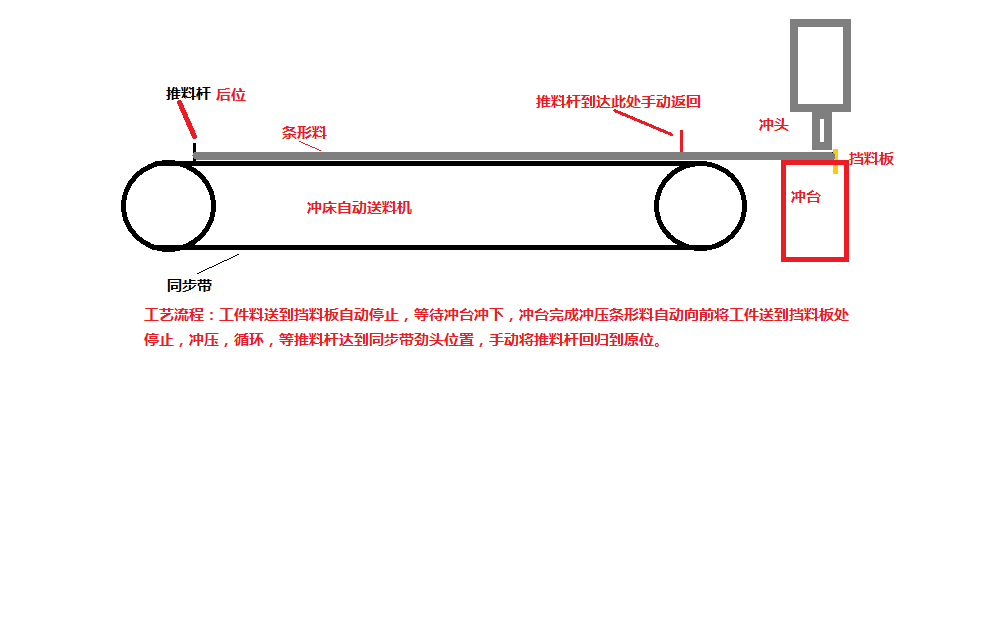 2工作流程:上電,如果送料機構(gòu)如果沒有工件,手動后退到初始位置,沖壓工件放入送料機構(gòu),手動前進到擋料板位置,開始第一個工件沖壓,沖壓過后,送料機構(gòu)自動送料到擋料板位置停止,第二次沖壓,以此類推,循環(huán)到推料桿到達(dá)最前位,手動退回到初始位置,放入第二個工件