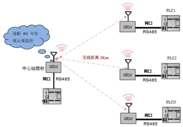 PLC需要接收傳感器的信號,或者控制設備啟停,但是現(xiàn)場條件復雜,不方便架線,就可以利用GRM110自帶的I/O來采集或者控制設備,同時通過無線發(fā)送和接收PLC的控制命令。