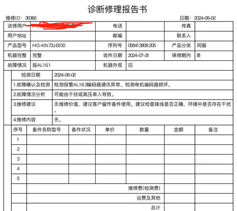 2.編碼器線自己焊接,有焊錯的情況,但我認為不至于燒電機編碼器。有兩臺前兩天都正常,今天開機又報16.3或者1E.1,編碼器線已經換成了供應商配套的電纜。更換電機后故障也消失了。