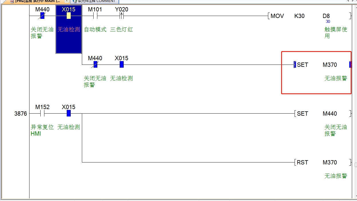 這段油位報(bào)警程序感覺不完善,置位M370這個(gè)是在HMI上顯示報(bào)警還是外部接燈之類的?而且沒有串入機(jī)床運(yùn)行主程序中,這樣不就形同虛設(shè)了嗎?機(jī)床還是可以運(yùn)行啊,