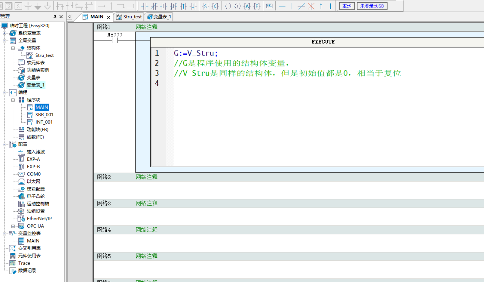 請教各位大佬,匯川EASY結構體,比如定義了 電機1.啟動、電機2.啟動、電機3.啟動、電機4.啟動、電機5.啟動、........,類型是bool,我如果要批量復位的話,該如何寫?我用了ZRST 指令,好像不能全部復位,總不能一個一個去單獨復位吧?