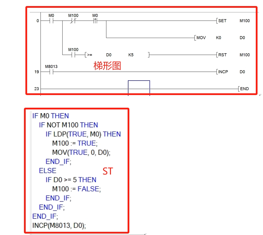 用ST寫的那段,第一次M0 On后M100能On,在5秒后M100自動為Off,而M0再次On時M100卻不會為On;用梯形圖寫的這段,M0為On時M100就On,在5秒后M100自動為Off,而且M0再次On后M100也能為On。以上兩段程序運行原理一樣,梯形圖寫的執行效果符合預期,而用ST寫的卻差強人意,同樣都是FX3U的程序為什么執行效果卻不一樣???