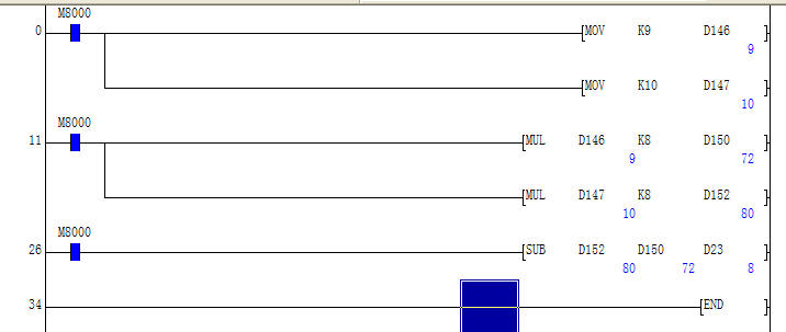 如果D146乘以K8得的結果不大于32767,就比如9乘以8得72,那么72它就 保存在D150還是D151,還是保存在(D150  D151)中,以至于下面可以用16位的減法?
