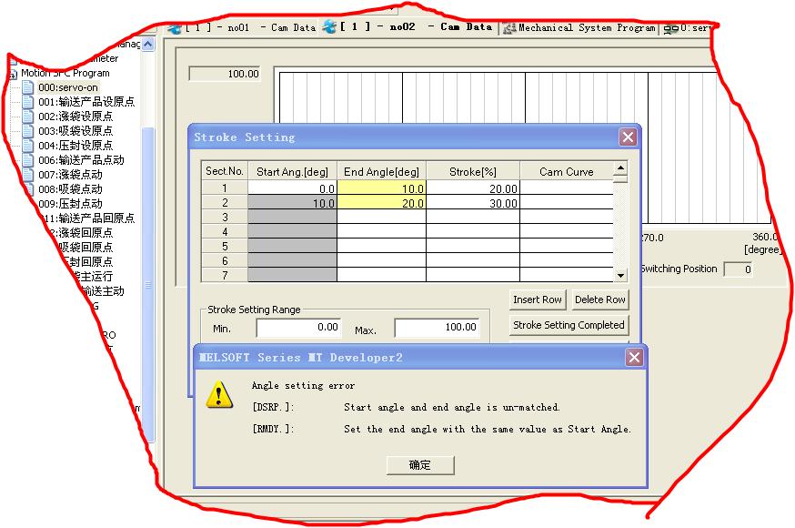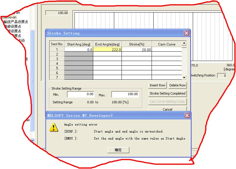 如上圖,為什么我怎么設(shè)置起始角度和結(jié)束角度還是出錯(cuò),并彈出如下菜彈,真是郁悶,三菱杭州公司那邊的人都不知到那里了,今天打電話沒(méi)人接,真是的,希望那個(gè)用過(guò)這軟件的朋友發(fā)表一下高見(jiàn),謝謝!,不知錯(cuò)在那里?