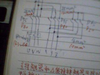 75KW用:多股銅心錢50MM,選用兩個95A這兩個接觸器并聯用作三角形聯結用,一個65A的接觸器作Y形用!