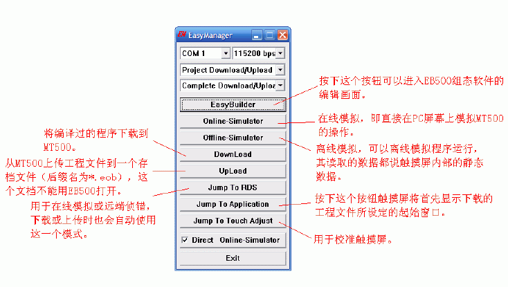 在你電腦"所有程序"找到EasyBuilder 500 cn子菜單下的"EasyManager"雙擊打開,就可以看到樓上的那個界面