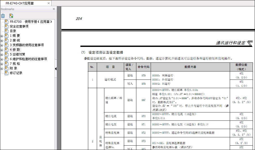 引用引用第6樓月澤于2009-06-20 18:19發表的 :我只是記的 ED 對變頻器操作 無非就是 控制啟停 正反轉 寫頻率 監視 讀參數...我以前也不知道去那找,呵呵 師傅教我的...才知道去那里找根據樓上的斑主,我下了個FR-E700的PDF看看 就在第4章 參數里面有205頁.......