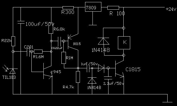 要求是:1)供電電壓是24v           2)當(dāng)紅外線接收管接收到紅外光時能夠驅(qū)動一個24伏繼電器閉合