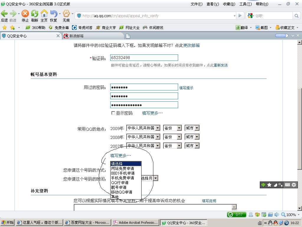 1,在申訴的有一項(xiàng)步驟里,填寫(xiě)QQ號(hào)的申請(qǐng)方式,我是在QQ的登錄界面點(diǎn)擊“注冊(cè)新賬號(hào)”來(lái)申請(qǐng)的(大致是這樣的,8,9年前的事了)請(qǐng)問(wèn)這是屬于什么申請(qǐng)方式?