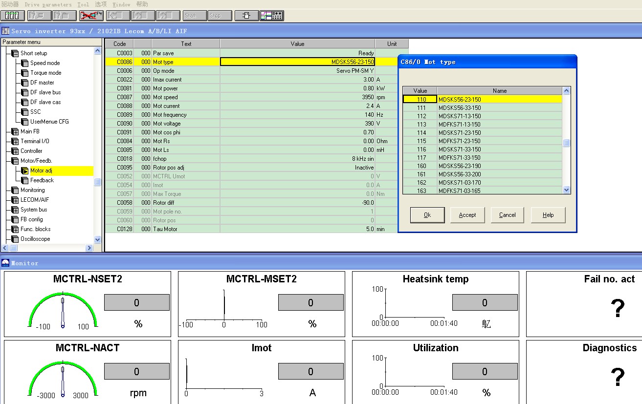 不考慮驅動器有問題,可用LENZE的伺服設置軟件,檢查伺服的參數情況和讀取伺服狀態。如果倫茨的伺服在運行狀態,有些參數是不能修改的,必須在STOP狀態才可以的。