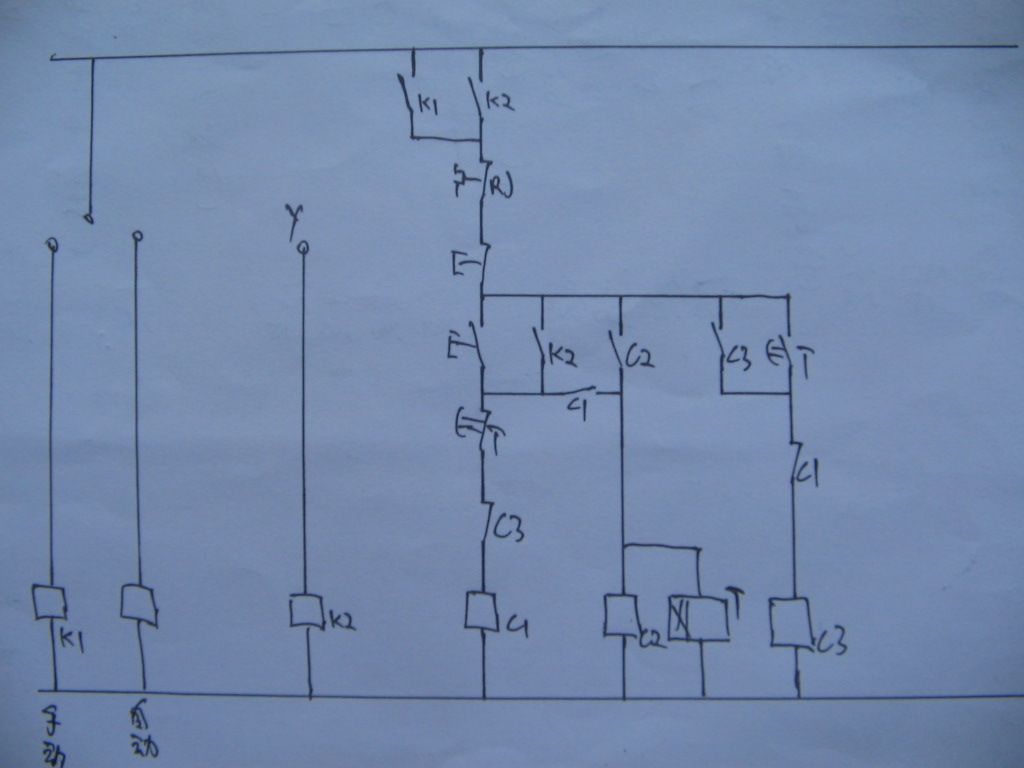 電機星三角手動起動時K1閉合,用按鈕控制接觸器起動及停止。PLC自動控制時,K2線圈得電,常開觸點閉合起動,K2失電停止工作(想利用PLC一個輸出點控制三個接觸器進行星三角起動及停止,這樣是否利用PLC控制中間繼電器再控制三個接觸器工作)。請問控制是否安全可行,另怎樣操作還會好些,可否畫圖說明。謝!