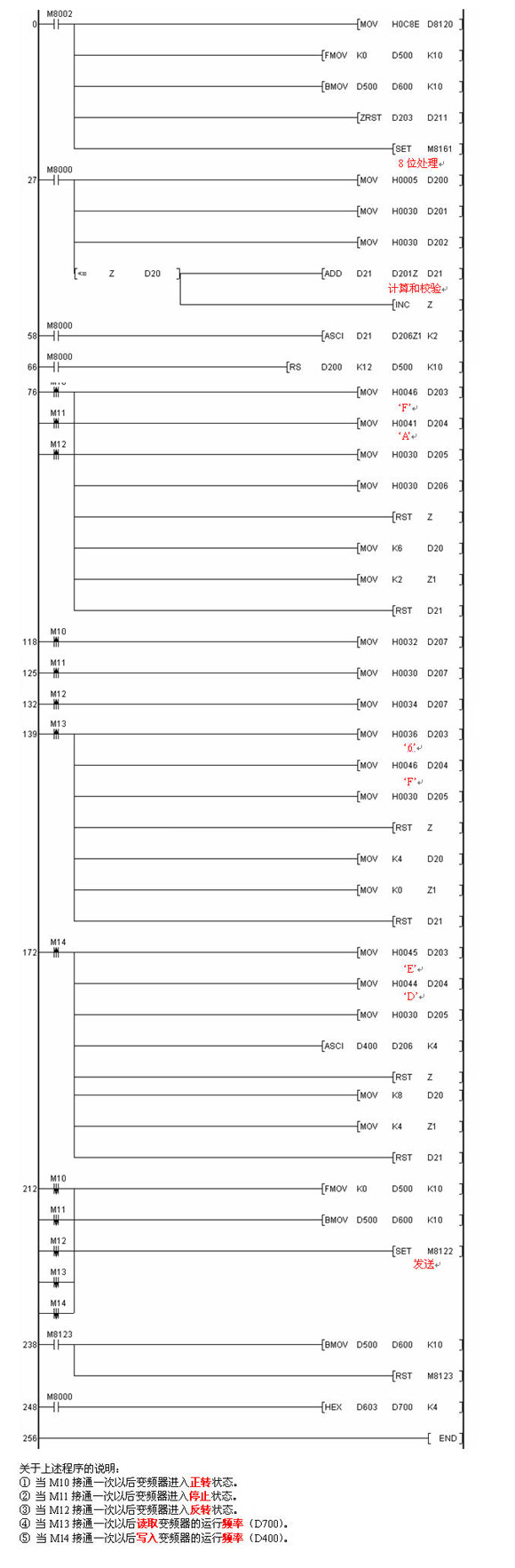有關(guān)利用三菱變頻器協(xié)議與變頻器進(jìn)行通訊的PLC程序如下: