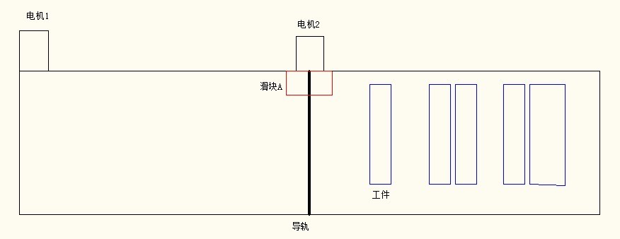 電機1一直轉,帶動工件運轉,當工件運行到導軌底下時電機1停止,電機2啟動,帶到滑塊A沿導軌運行到另一端立即再回到原點,然后電機1再啟動,直到下一工件到導軌底下,如此循環。