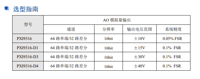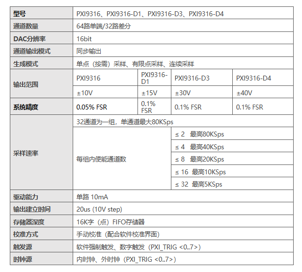 PXI9316系列是基于PXI總線的高密度模擬量輸出卡。該板卡提供64路單端/32路差分模擬量輸出通道,16bit的DAC分辨率可實(shí)現(xiàn)高精度的模擬量信號輸出,支持±10V、±15V、±30V、±