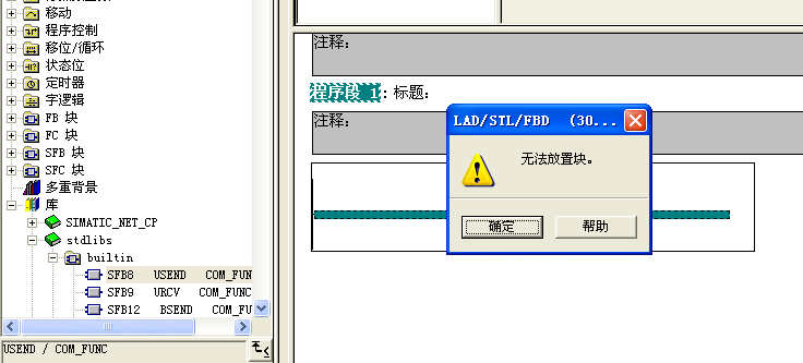 我在OB1里面調用庫里面的“stdlibs”里面的"builtin"里面的SFB或者SFC功能塊怎么都會顯示如載圖上的情況:“無法放置塊”,請各位高手給予我指點一下。