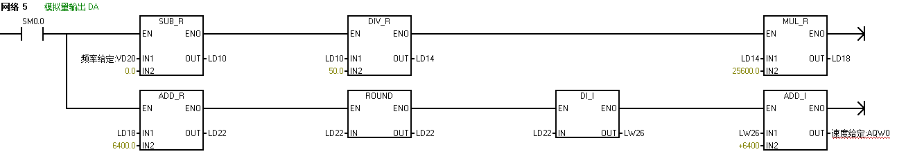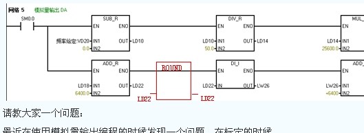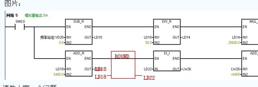 在紅色ROUND指令之前,你用的是浮點(diǎn)數(shù)計(jì)算,而后面又整數(shù)計(jì)算,顯然LD22數(shù)據(jù)類(lèi)型沖突,必須加入取整指令