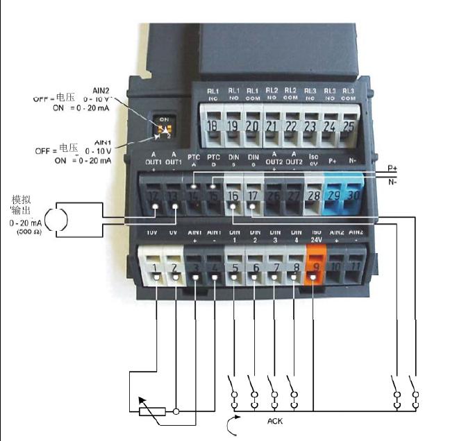既然是電位器調(diào)節(jié),那輸入電流方式0-10V ,變頻器電壓,電流選擇AIN1和AIN2應(yīng)該在OFF的位置,你的好像在ON位置,ON是4-20ma,