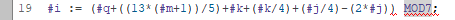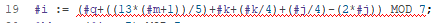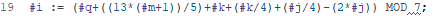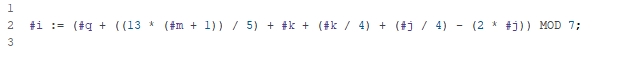 #i := (#q + ((13 * (#m + 1)) / 5) + #k + (#k / 4) + (#j / 4) - (2 * #j))MOD 7;