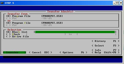 Transfer頁:Transfer from是從何處傳輸,選擇PLC(首先自動在線完成后改選項就變成可選了,否則為灰色,選擇后那個X就跑到下邊來了);Transfer to是傳輸到何處,選擇Program file,并將后面中括弧內文件名改成需要的;Selection是需要傳輸什么塊,一般上傳程序,在后面輸入“A”就可以了,是全部傳輸的意思。